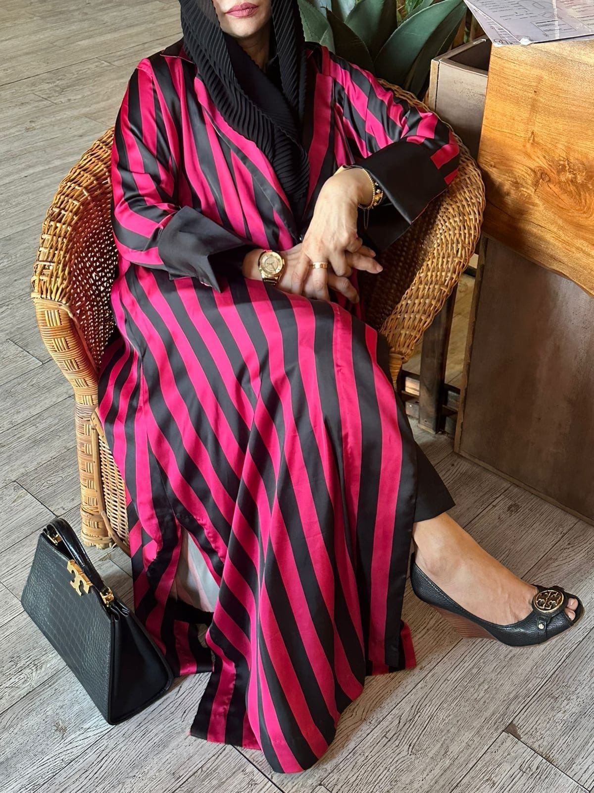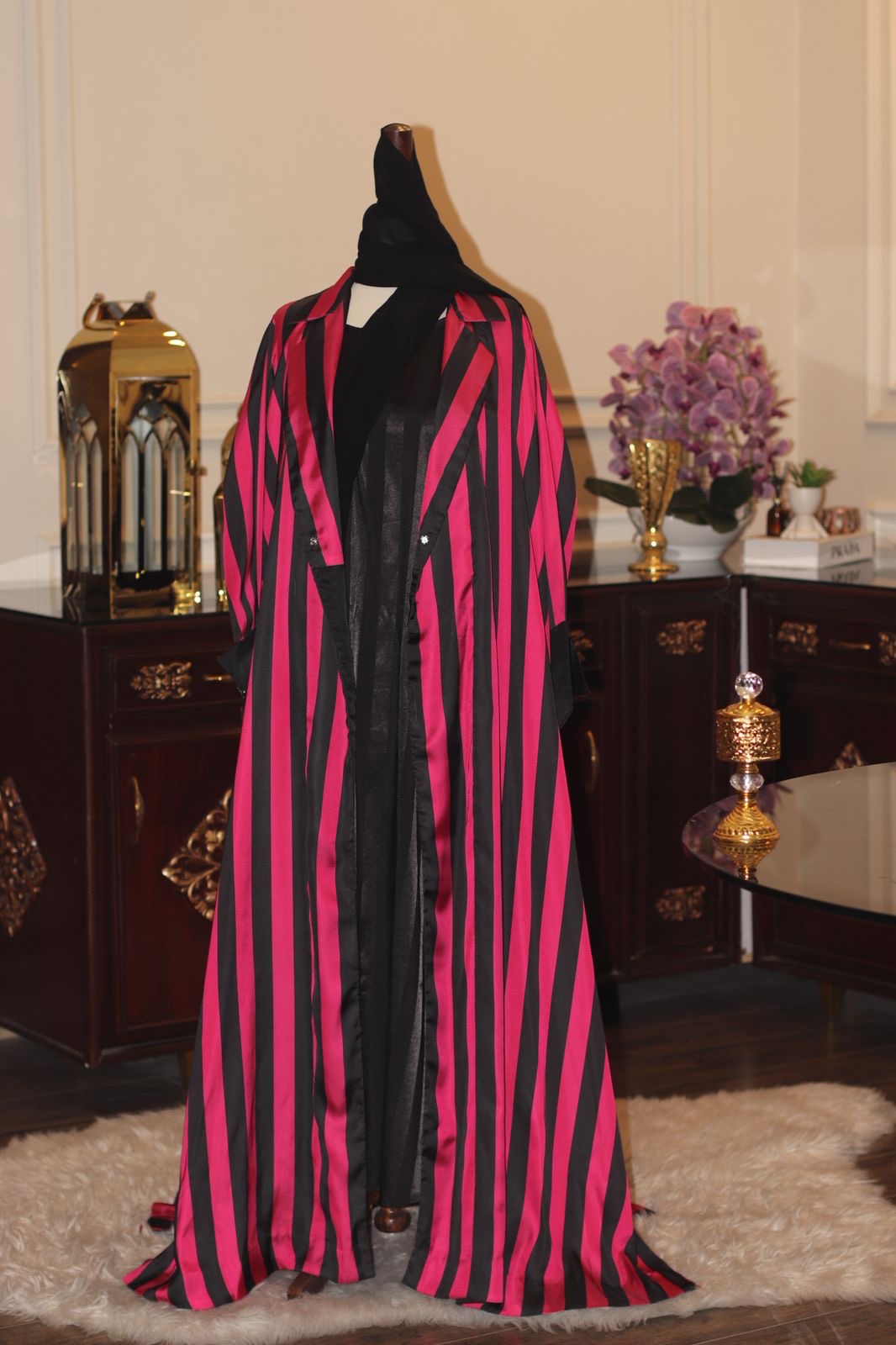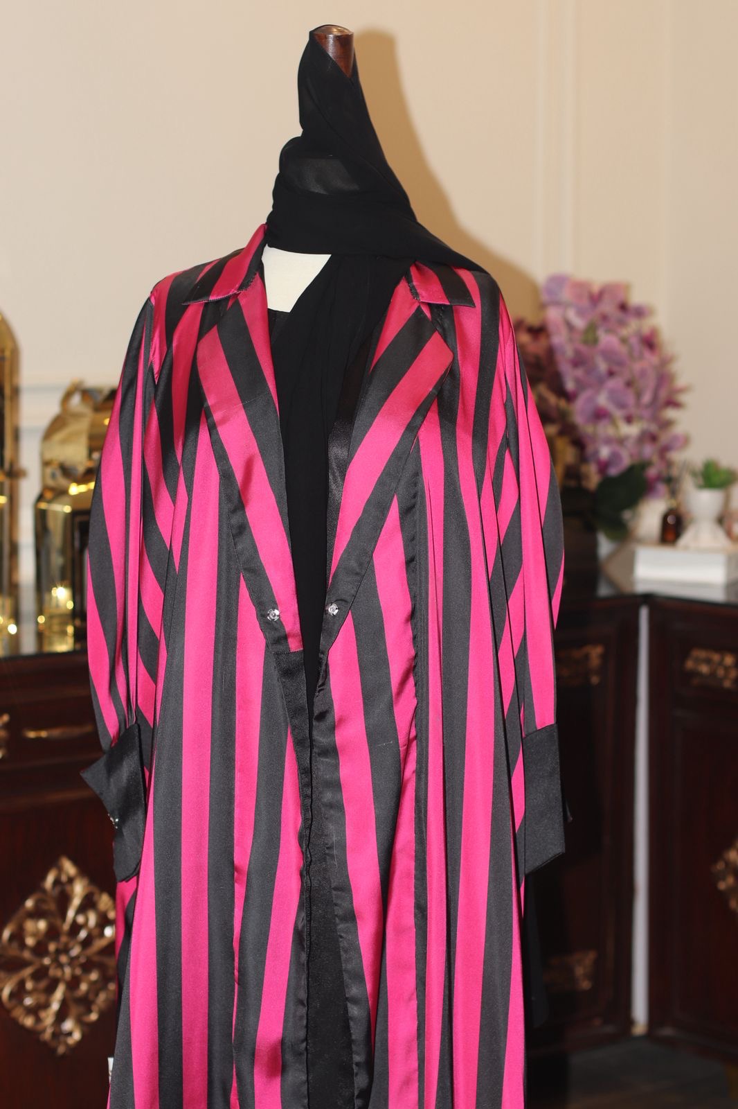 An avant-garde blazer-style abaya crafted from premium striped silk, merging a bold fuchsia and black palette with a sophisticated, structured silhouette.