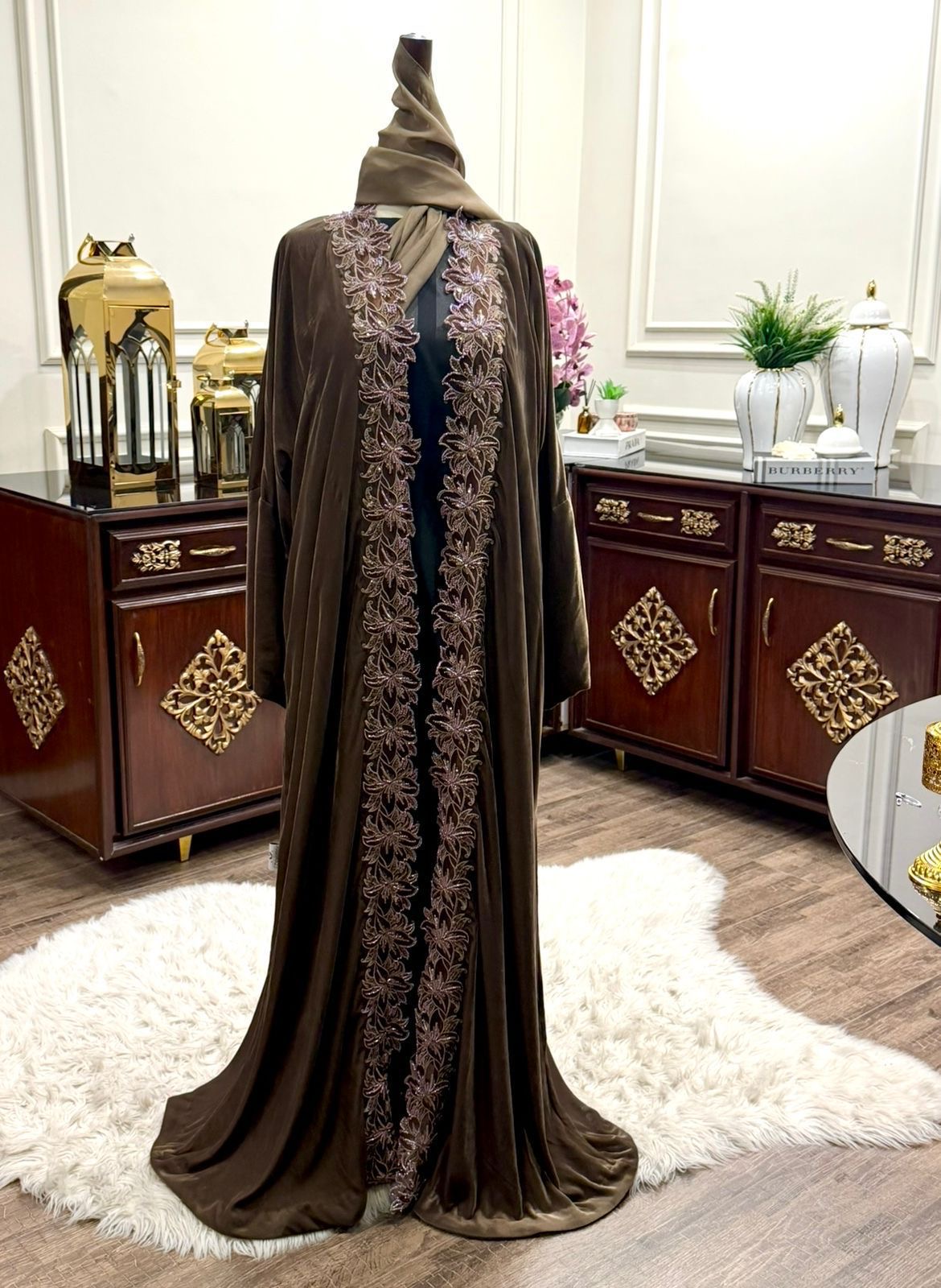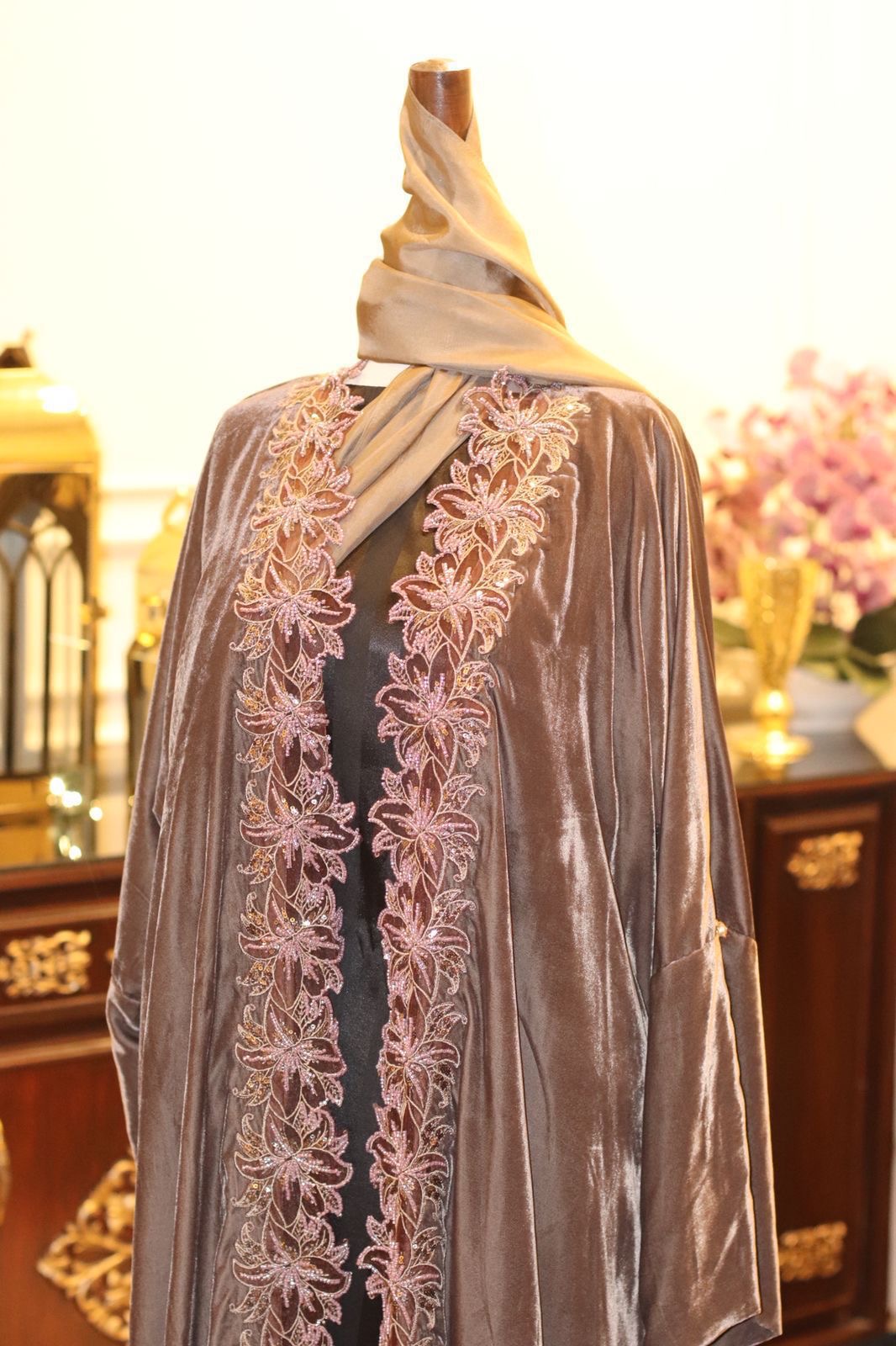 A graceful velvet abaya in a rich mocha brown, adorned with intricate floral lace embroidery and shimmering accents for a timelessly feminine appeal.