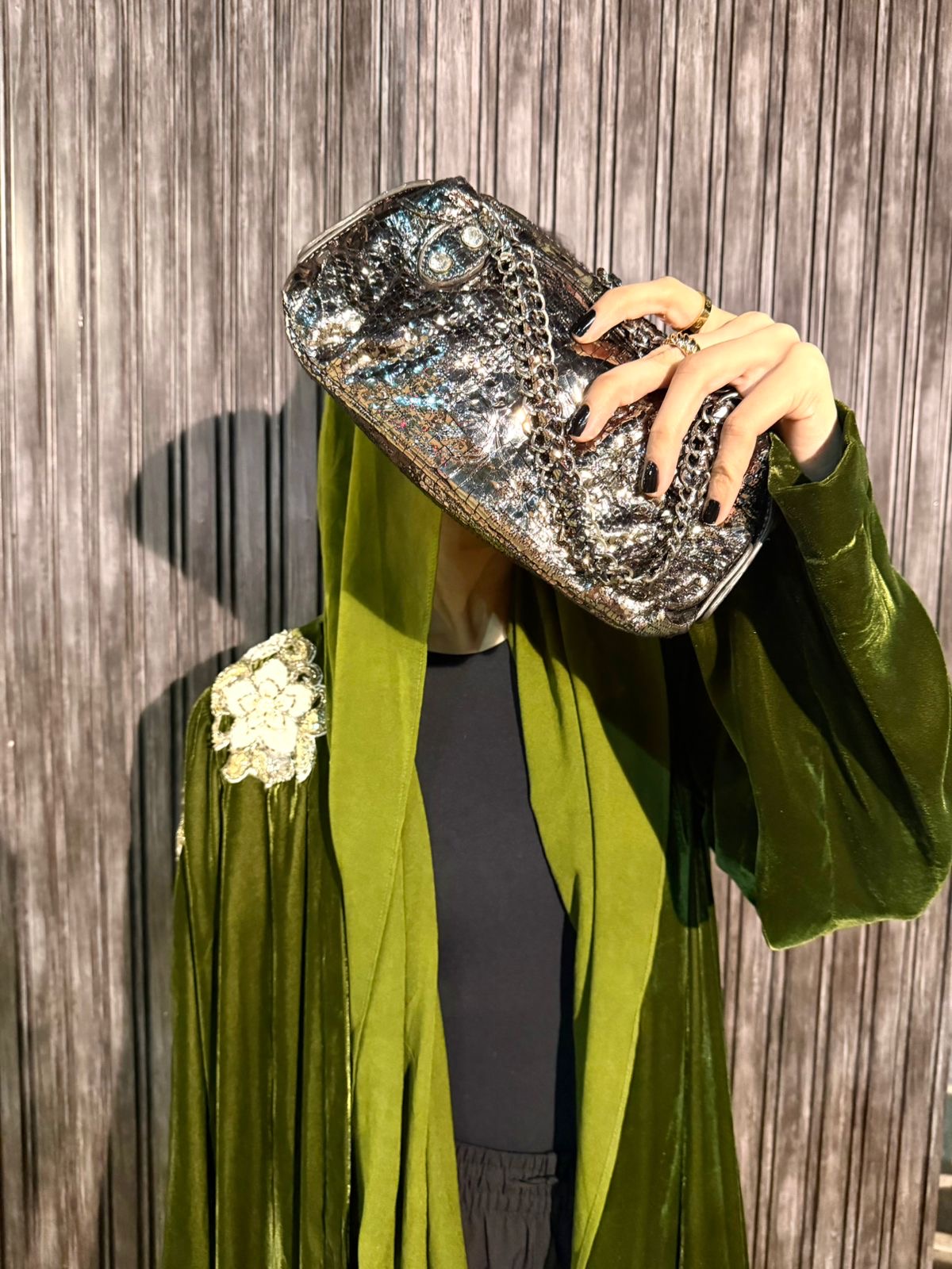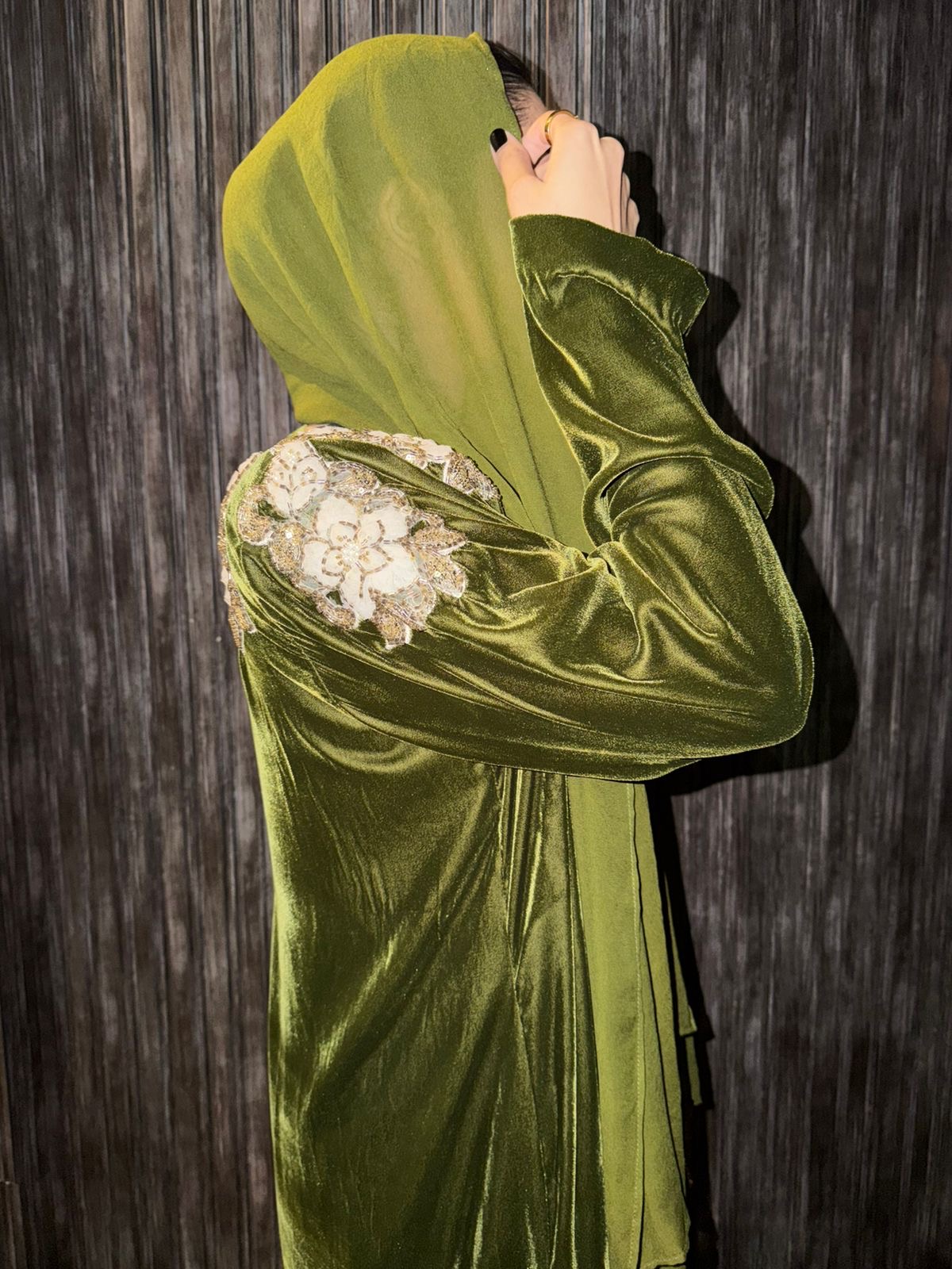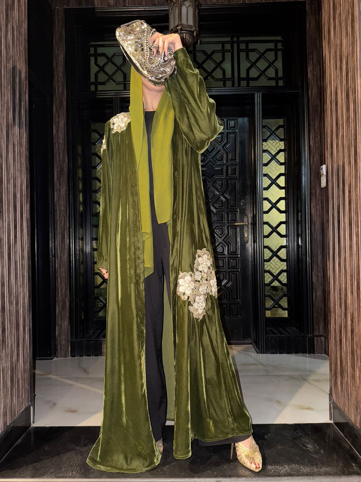 A regal velvet abaya defined by opulent floral appliqué and meticulous beaded detailing, designed for an aura of timeless, high-end sophistication.