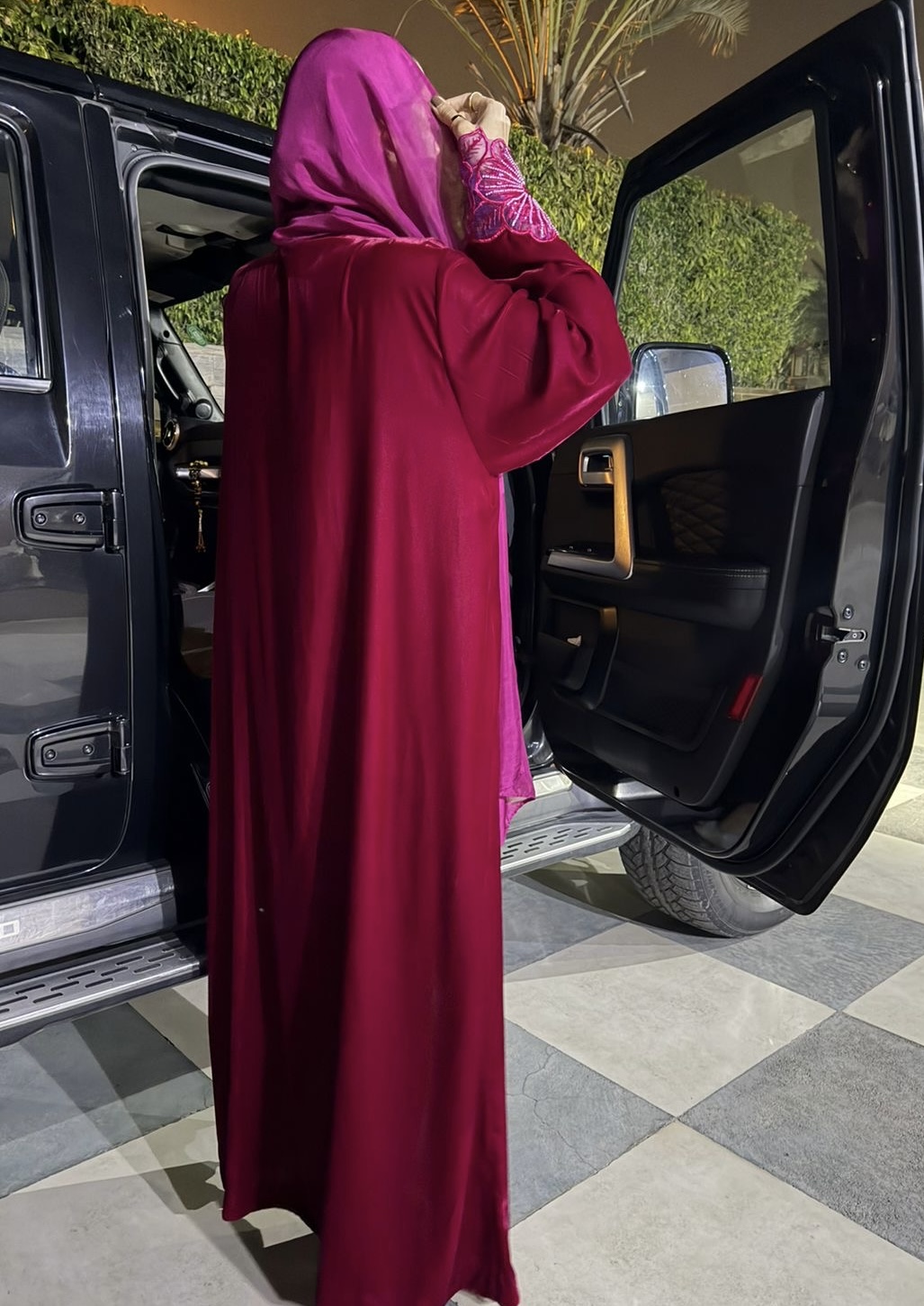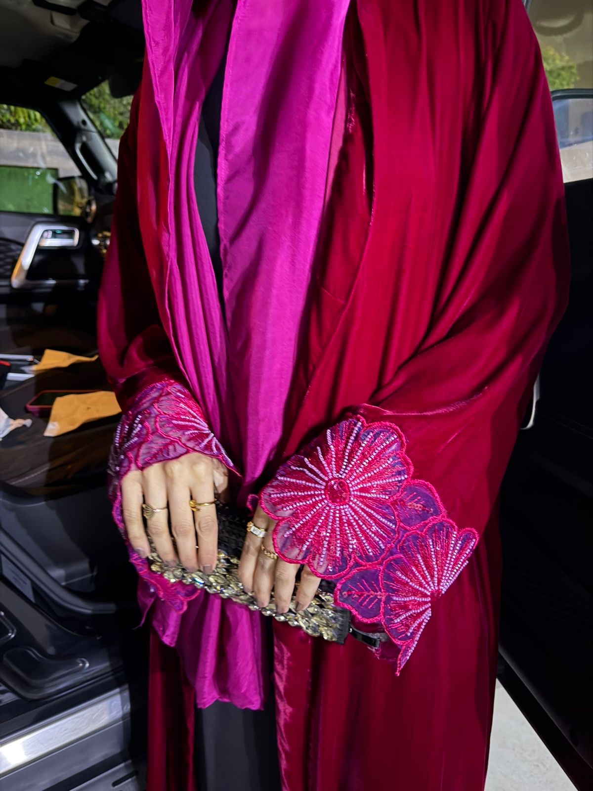 An opulent, front-open silk-velvet abaya featuring exquisite floral lace cuffs and delicate beadwork for a striking, high-fashion statement.