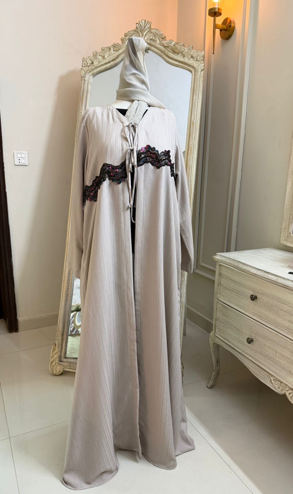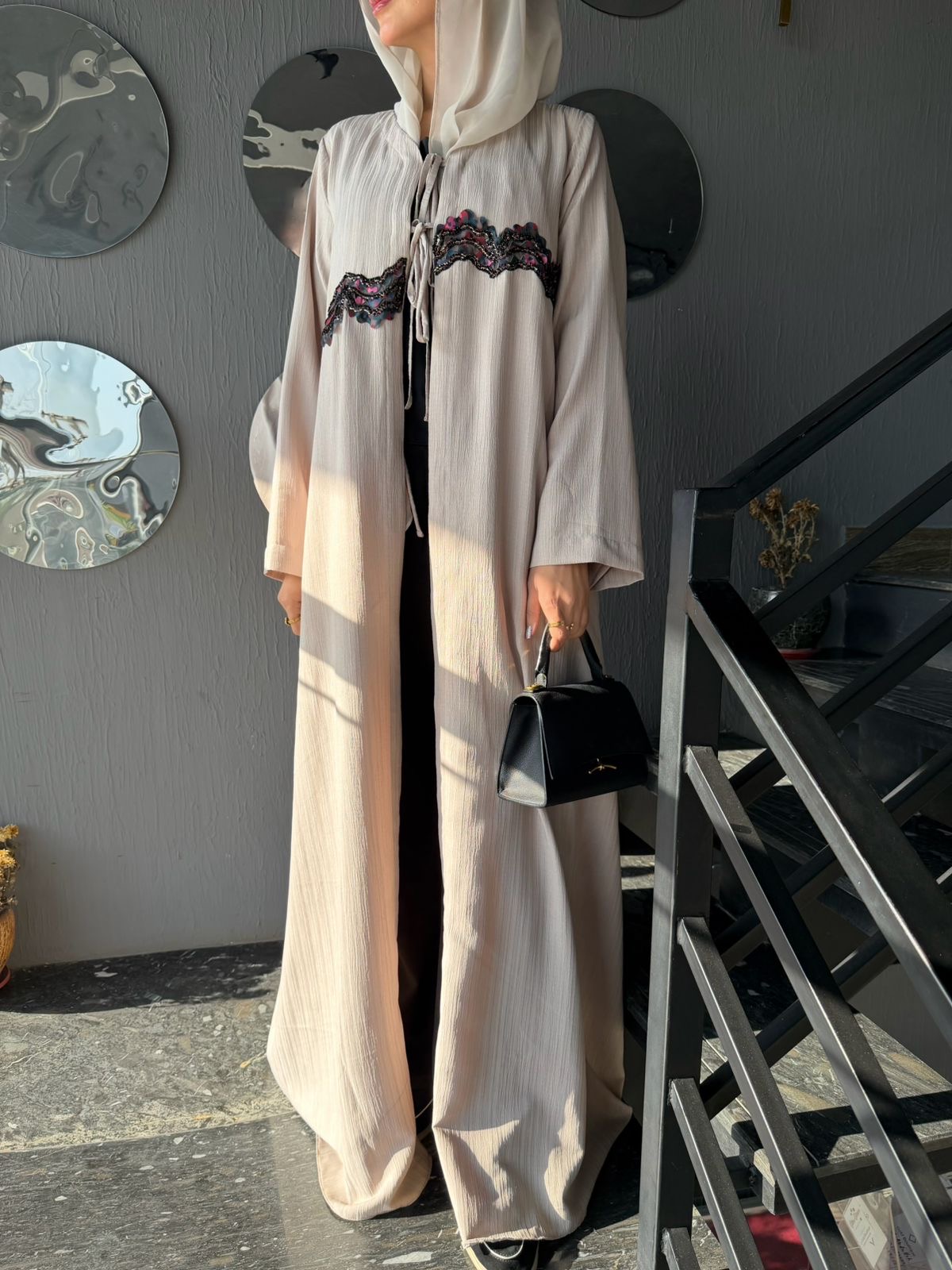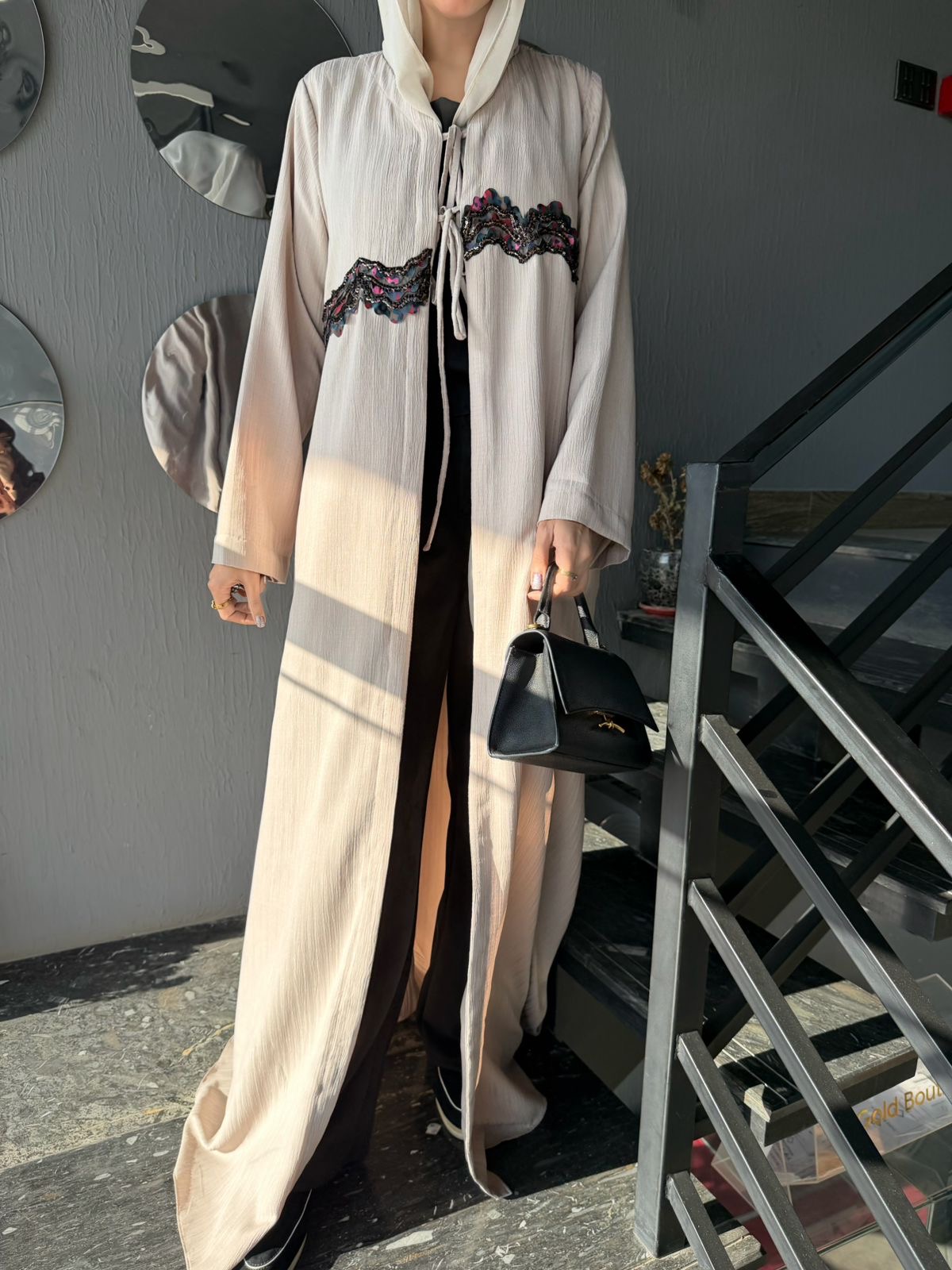 A chic, front-tie abaya crafted from premium textured crepe, accented with striking wave embellishments for a contemporary, feminine finish.