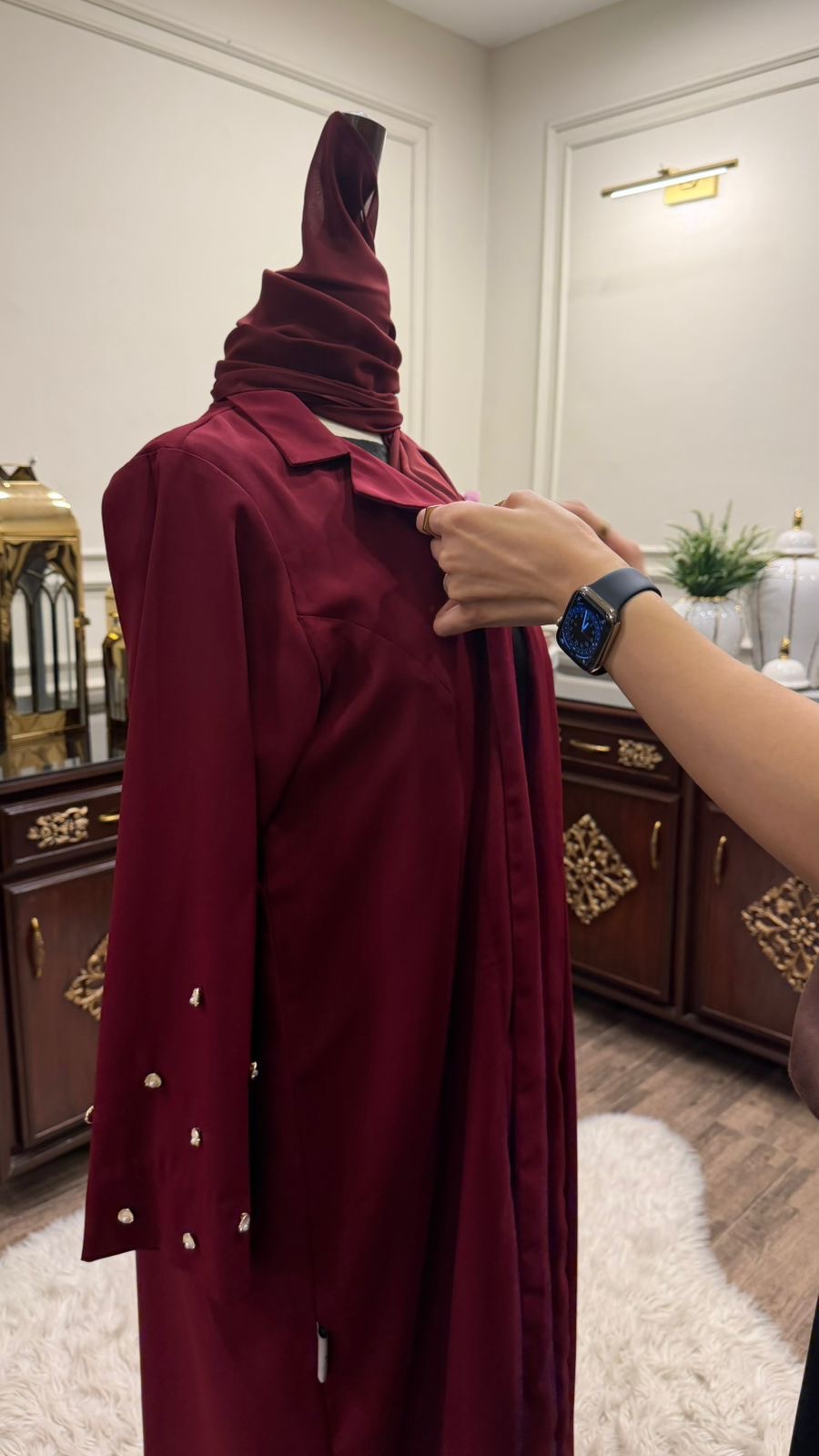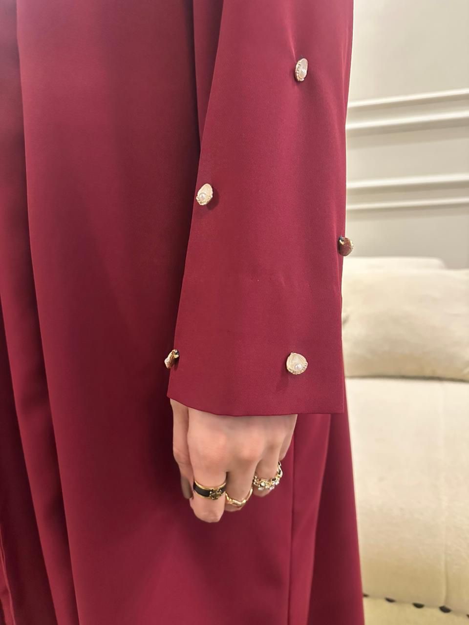 A sophisticated blazer-style abaya crafted from premium cotton twill, featuring a tailored lapel collar and delicate pearl-embellished sleeves for a polished, boardroom-ready look.