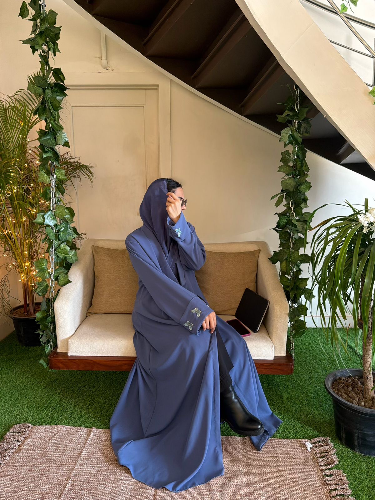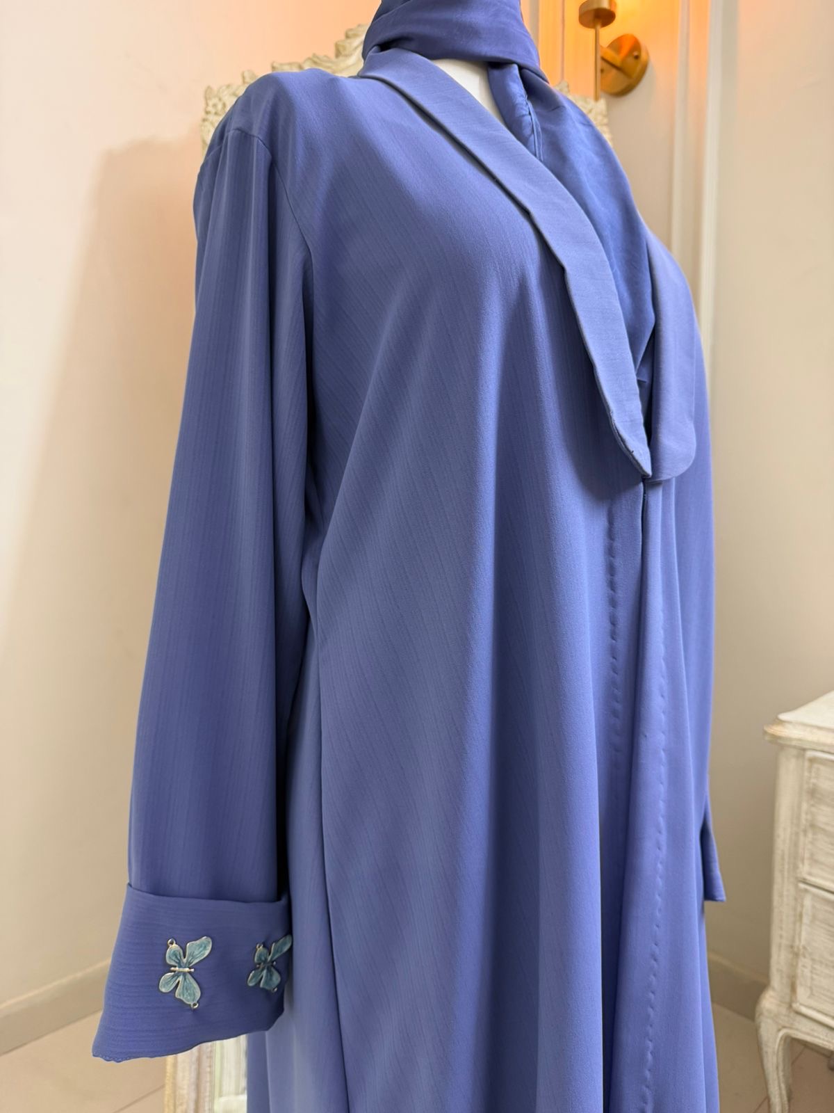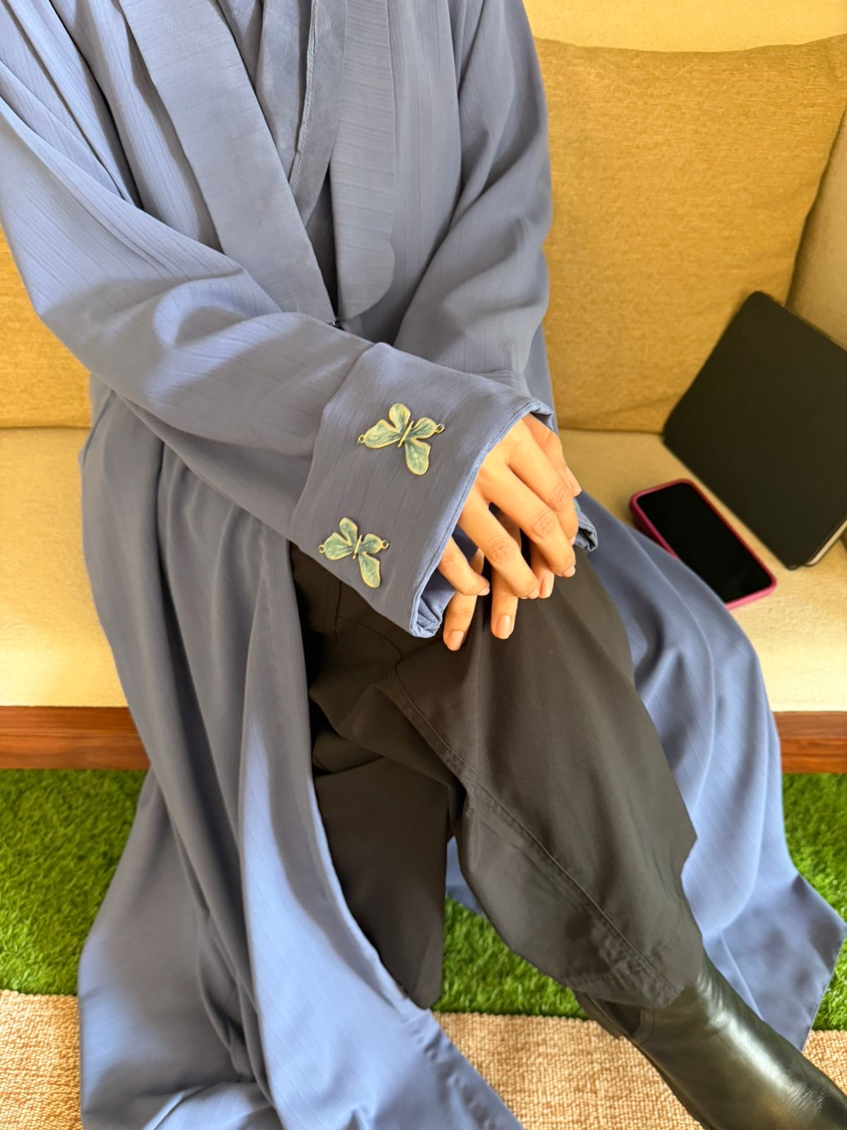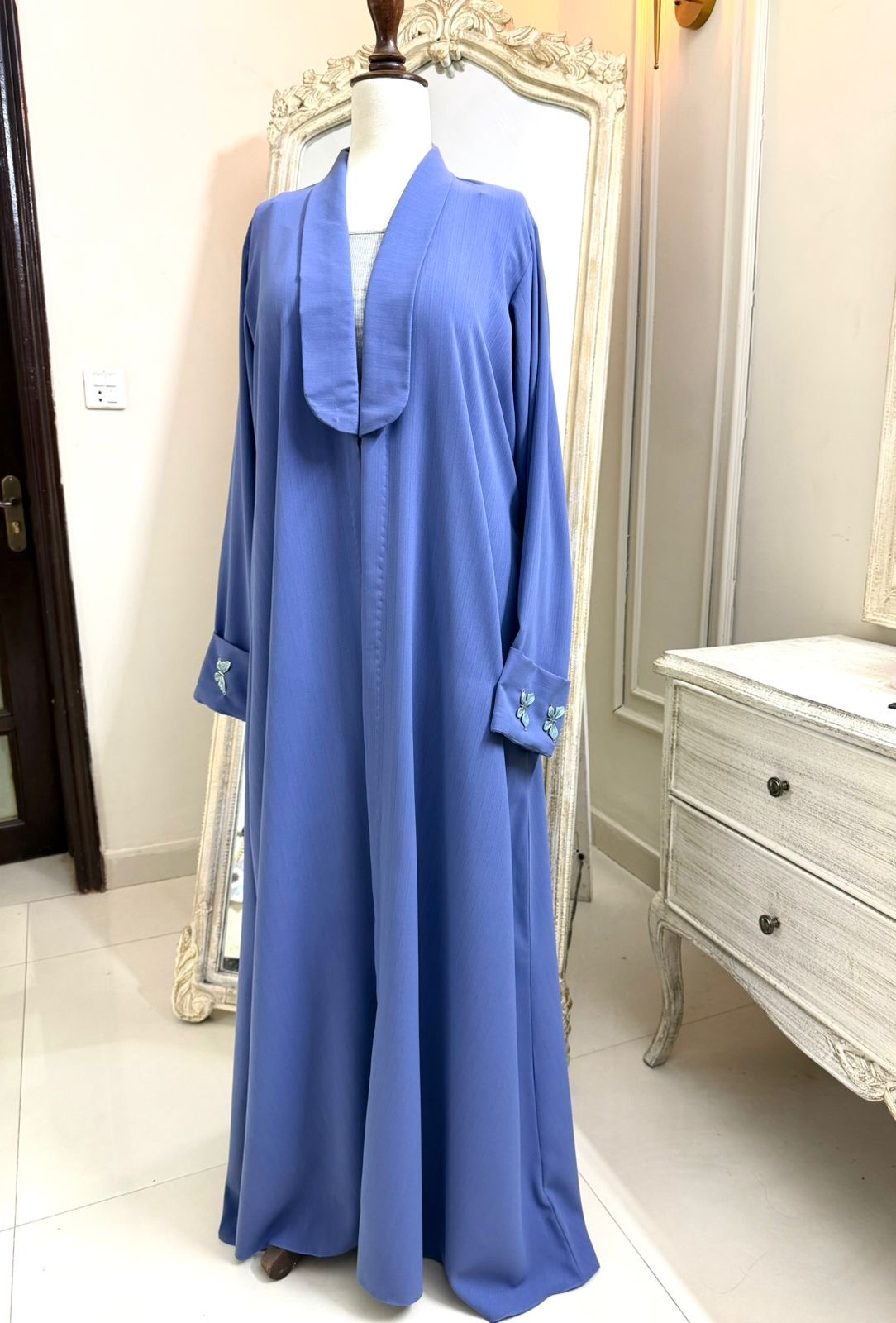 Crafted from premium textured crepe,, this versatile powder blue abaya transitions seamlessly from high-stakes meetings to elegant social gatherings with its modern shawl collar and delicate butterfly cuffs.